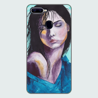 Акварельная девушка с закрытыми глазами и черными волосами.