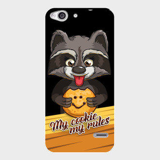 Енот показывающий язык держит печеньку с надписью My cookie my rules